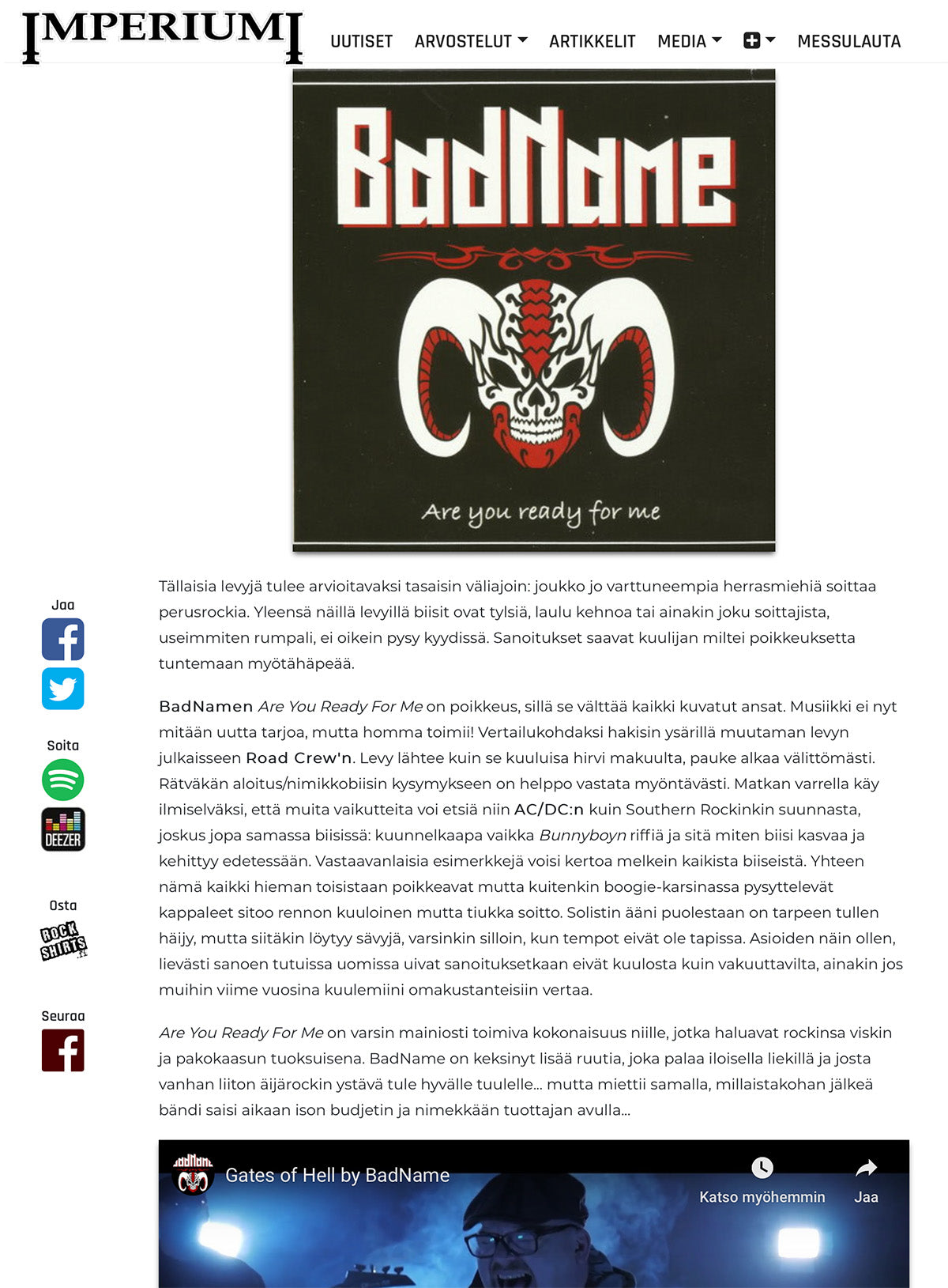 Vaikutteita BadName ammentaa legendoilta kuten Rhino Bucket, AC/DC, John Mellencamp ja Airbourne, ja tämä kuuluu yhtyeen rouheassa, suoraviivaisessa ja tinkimättömässä soitossa. Musiikki on rehellistä, konstailematonta ja ennen kaikkea soiton ilosta kumpuavaa – juuri niin kuin kunnon rock’n’rollin kuuluukin olla.